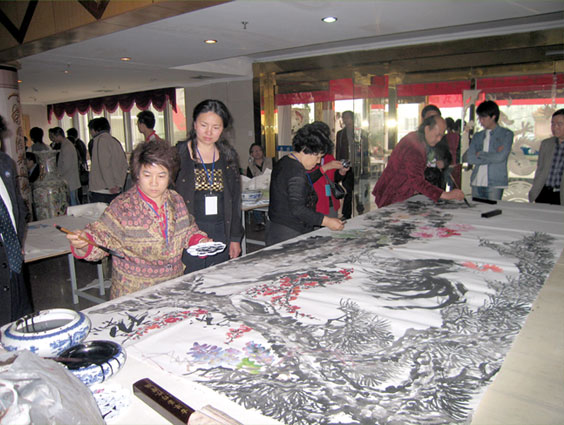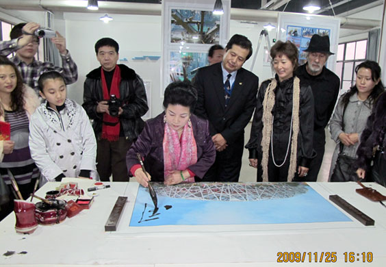 傅继英老师在北京“798”第四届中国(北京)国际文化创业产业博览会上为央视题写“同一个世界 同一个梦想”