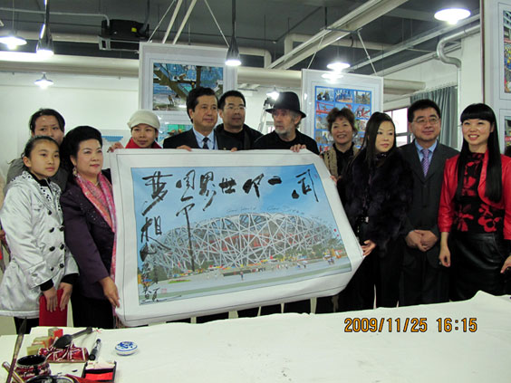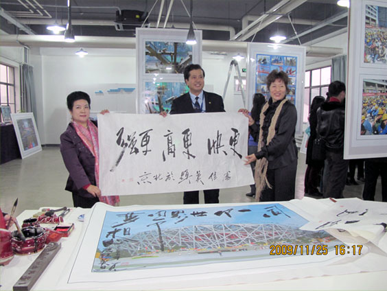 傅继英老师在北京“798”第四届中国(北京)国际文化创业产业博览会上为央视题写“同一个世界 同一个梦想”.