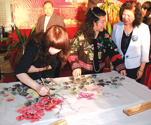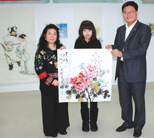 傅继英老师和嘉宾观看学生在现场绘画“牡丹”