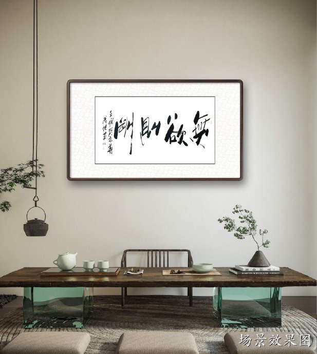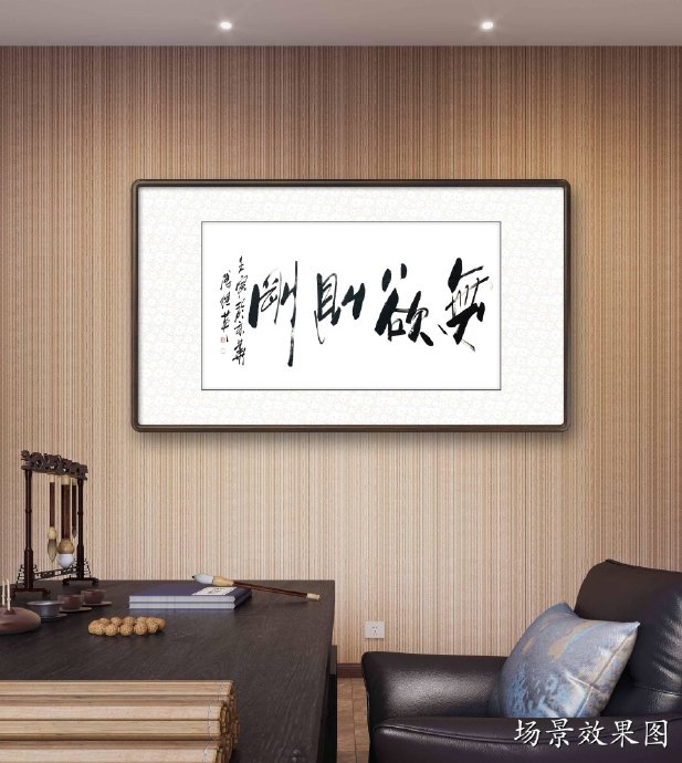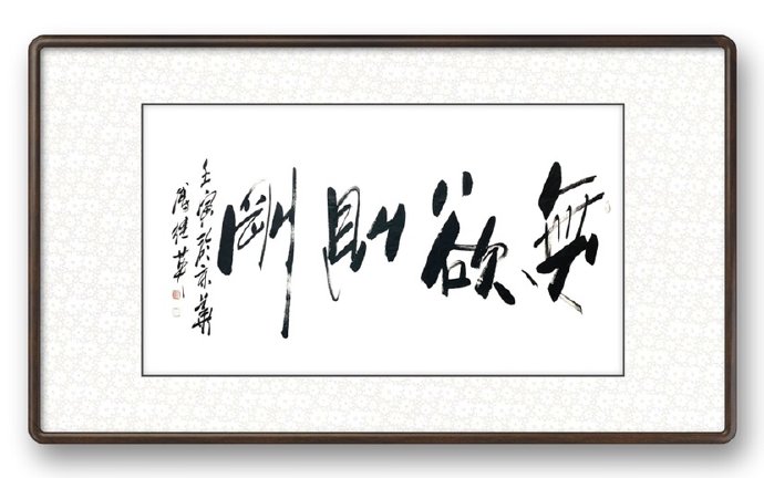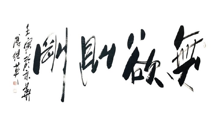 傅继英书法:无欲则刚。意思是指千仞峭壁之所以能巍然屹立,是因为它没有世俗的欲望。借喻人只有做到没有世俗的欲望,才能达到大义凛然的境界,出自《论语·公冶长》。指不被自己想要得到的某种利益所诱惑,就是达到了真正的刚义。