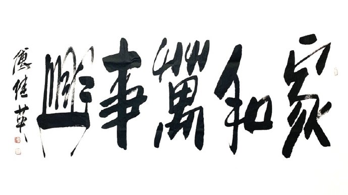傅继英书法:家和万事兴。从字面上讲是家庭和睦,万事兴旺发达的意思。从含义上讲只有家庭和睦,家庭成员互相关心,互相爱护,老人要做到抚养教育。子女的责任,子女要尽到孝敬赡养老人的义务,全家人团结一致,做一切工作,才能兴旺发达。