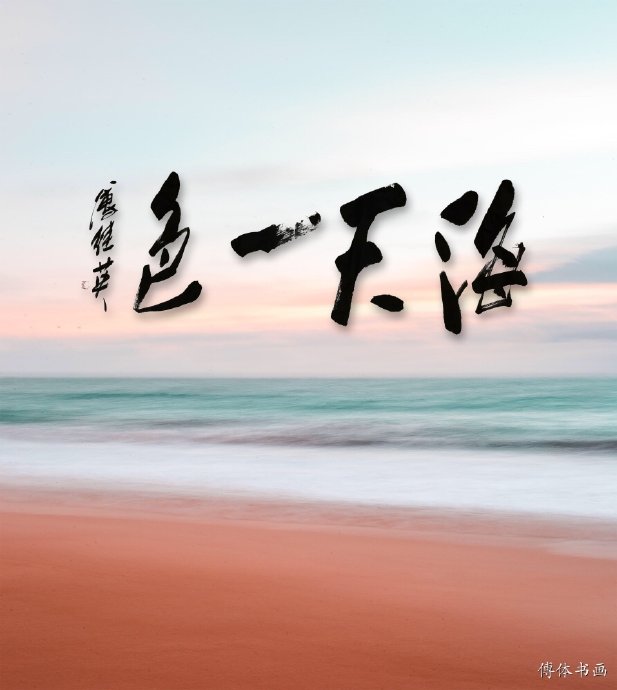 傅继英书法:海天一色。海和天成为一种颜色。比喻海和天都很广阔,一眼望不到边,好像连在一起一样。天空蔚蓝,大海的水天之际,交融一体的视觉美景。也可以用于形容朝阳或落日的朝霞或晚霞染红大海,交融一体的视觉美景。海天一色 ,碧水蓝天 ,诗与远方 ,唯美意境 ,蓝天白云定会如期而至 。