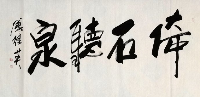 傅继英书法:倚石听泉。依靠着石头,听泉水的声音,形容一种对大自然亲近的感情。出自唐代李白的《寻雍尊师隐居》,拨云寻古道,倚石听流泉。诗人穿过雾隐云横的丹岩翠壁奋力攀登之后,斜靠在长藤古树之上,一览众山景色,倾听流泉欢歌。上句从视觉着笔,写行寻的艰难和乐趣;下句则从听觉落墨,流泉叮咚,沁心悦耳。