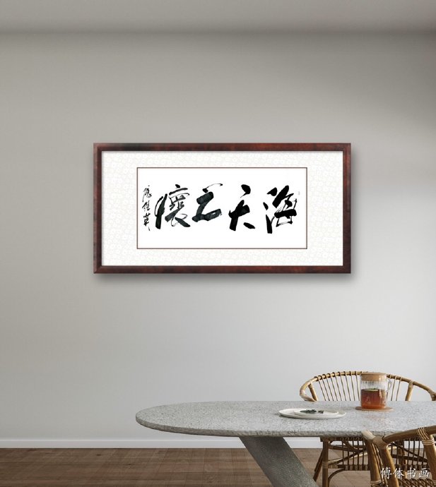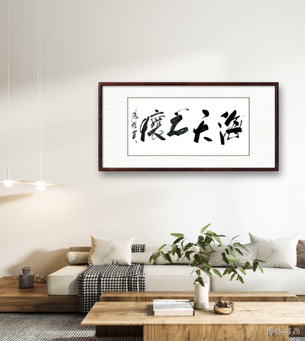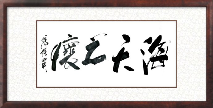 傅继英书法作品分享:海天之怀。高而可登,雄而可亲,松石为骨,清泉为心,呼吸宇宙,吐纳风云,海天之怀,华夏之魂。