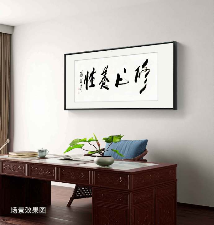 “修心养性”,正如一盏明灯照亮黑暗的夜晚,指引着人们走向正确的道路。在现代社会,面对瞬息万变的世界,人们往往被物质欲望、功利心态所困扰,容易迷失自我,忽略了内心的修炼与提升。因此,我们更应该铭记“修心养性”的寓意,坚持修身养性的重要性。只有通过修心与养性,才能使自己成为一个有思想、有情感、有品德的人,才能在人生的道路上行稳致远。客厅书房字画傅继英书法作品《修心养性》心灵修行内在力量的觉醒