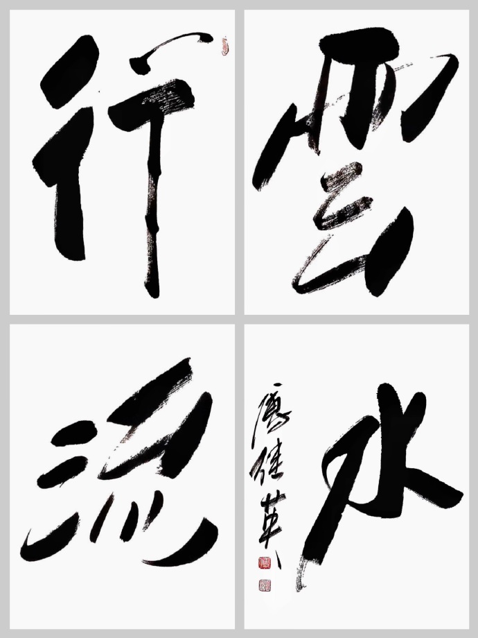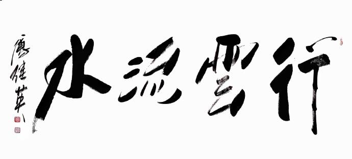 傅继英书法:行云流水。云在天空自由飘荡,水在大地静静流淌。生命如云,自由自在;生命如水,不为所动。行云流水,是大自然的千古传奇,也是人生的启示。它告诉我们,不要被外界的干扰所左右,保持内心的平静和坚定,随心而动,才能收获真正的自由和快乐。