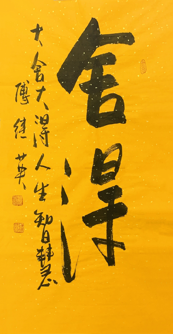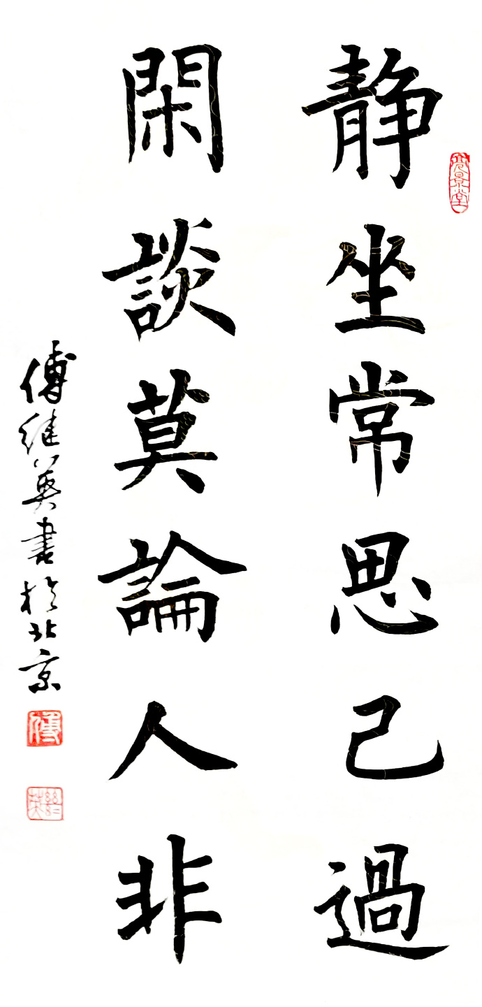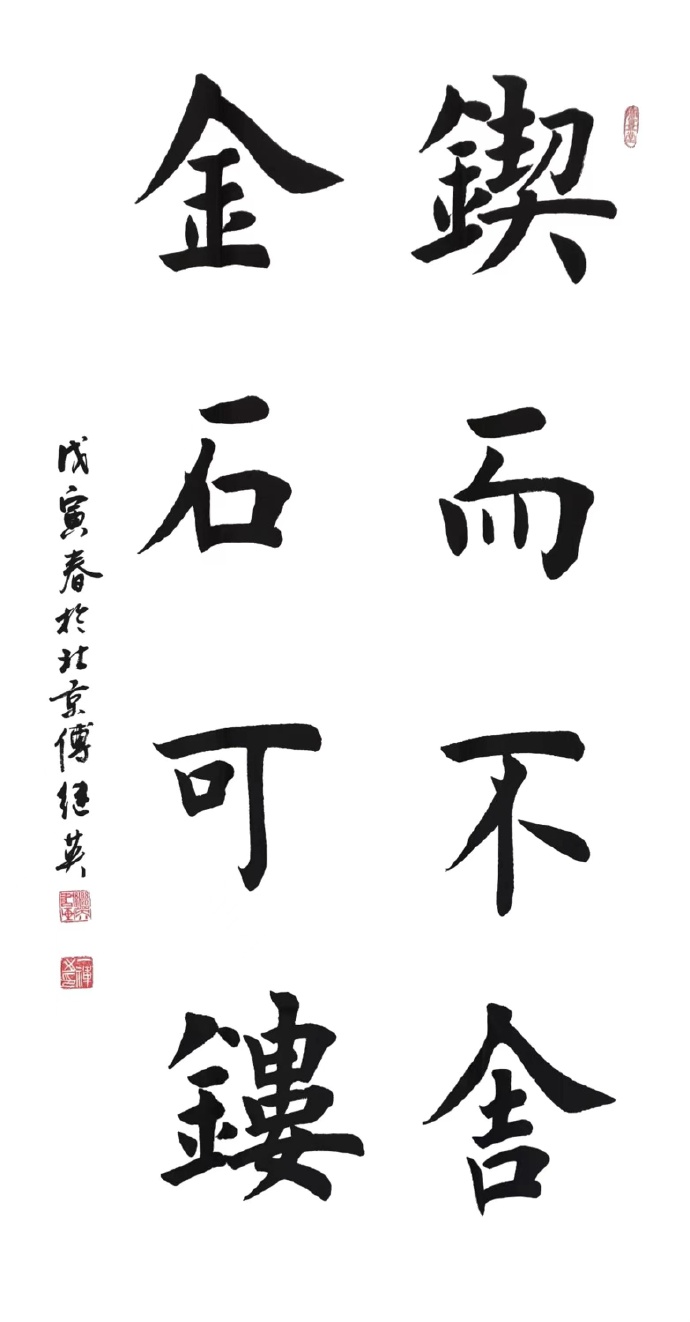 2. 内涵的深刻:在傅继英老师的书法作品中,字与字之间的间距、笔画的流畅连贯均透露出一种和谐之美。这种布局不仅令作品在视觉上呈现出独特的审美韵味,更隐喻了生活的节奏与平衡。书法中的每一笔、每一划,宛如低语,启示我们面对生活的挑战与逆境时,应保持内心的平和与坚定,追求一种内在的和谐与真实。