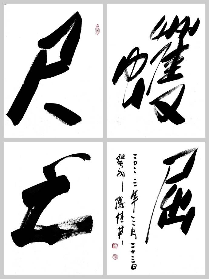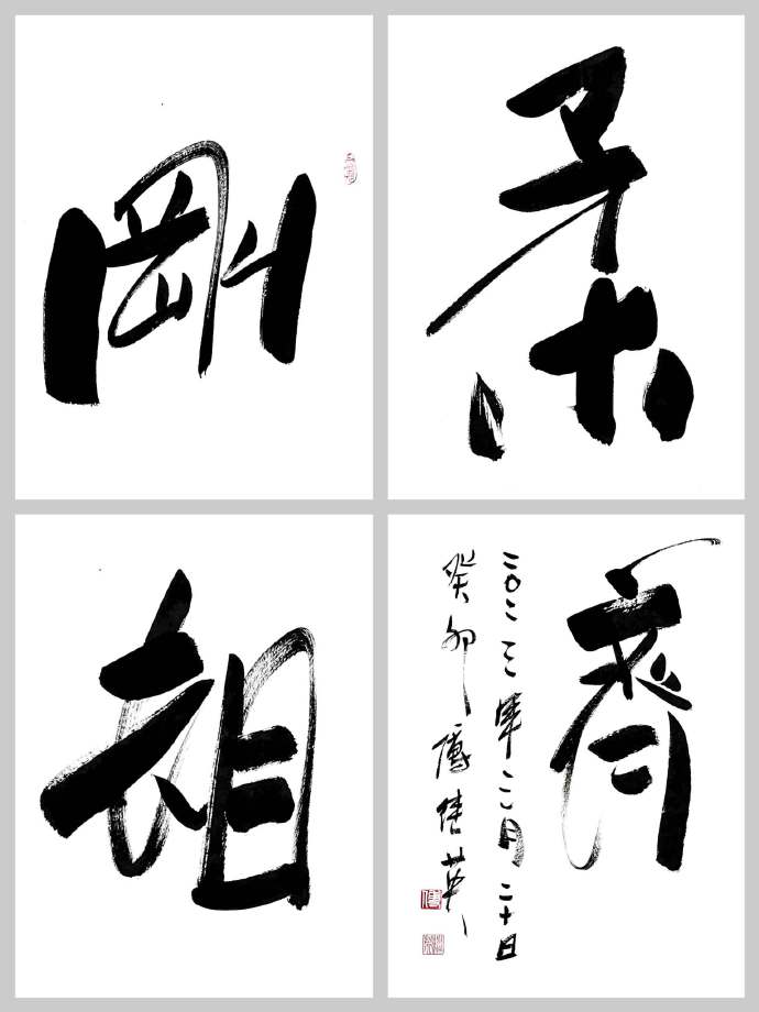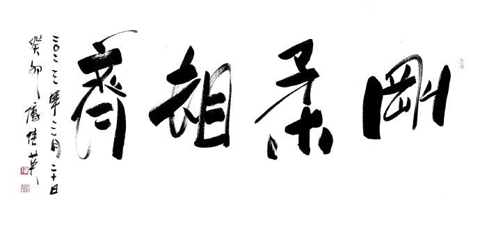 傅继英秒懂成语书法作品:刚柔相济。意思是刚强的和柔和的互相调剂。出自 《周易·蒙》。人们常说,刚柔相济是人生的一大智慧。书法是中国的国粹,也是世界上最优美、最有观赏性的艺术。它具有刚柔相济的特点,既能直抒胸臆,又有圆滑变化的风格,往往虚实相生,内涵丰富而寓意深远。