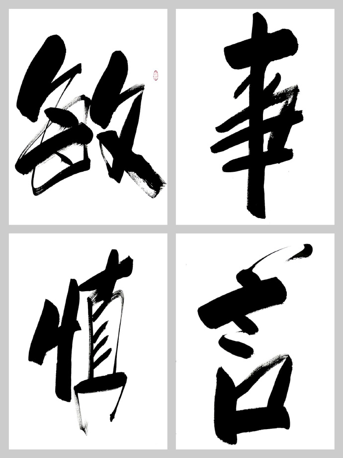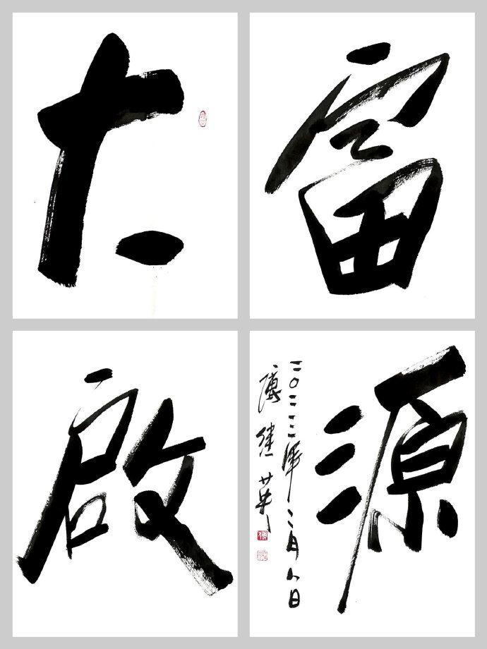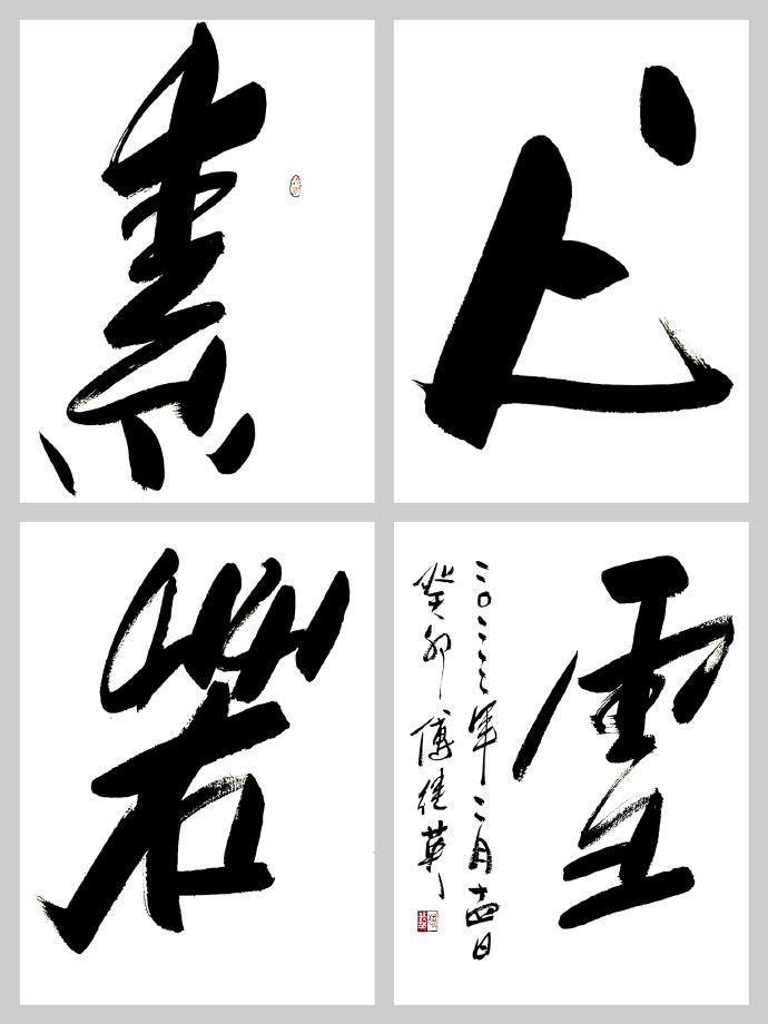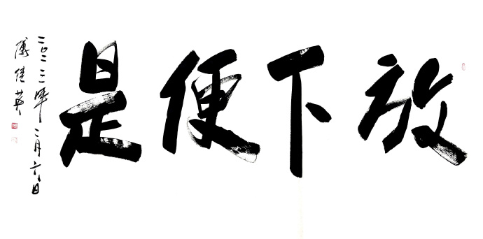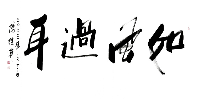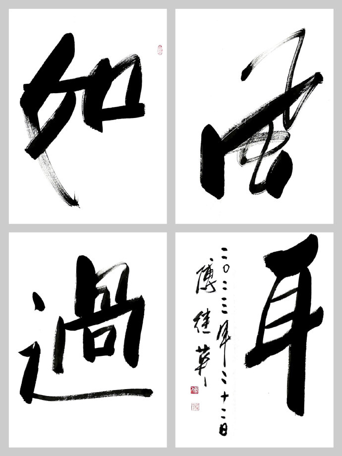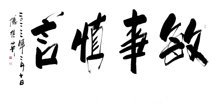 吾曾有幸同友人拜访了傅继英老师工作室,亦有幸亲眼目睹了她现场挥毫,深感老师之风采非比寻常。观傅继英老师之书法:下笔疾时如风驰电掣,缓时如太极轻舞;力透纸背,横、竖、撇、捺干净利索;聚墨处凝重沉着,飞白如丝幕轻扬、如涓流倾泻;令吾辈观者大感酣畅淋漓之痛快。作品或浑厚、阳刚,誓要横扫千军之霸气;或有柔美之作,如贵妃醉酒般雍容华贵,如处子怀春之娇羞含蓄。且看她的“虎”字系列作品,单一个“虎”字,其气势就已经让人闻风丧胆了,再配以“扶摇直上九万里”,大有上天揽明月之势。再说说她的“金戈铁马”,傅继英笔下的金戈铁马是具有生命的,她给观者一种置身战场,热血沸腾的感觉。“戈”字犹如一个正在奋勇杀敌的士兵,在“马”字后飞扬的尘土中绝不倒下。细细聊来得悉傅继英老师不仅能书,且善画、工诗词。她曾画工笔观音、玉美人图在美术界也是获得了不少关注。艺界“巾帼”,书坛“首傅”--小记当代书坛大家傅继英