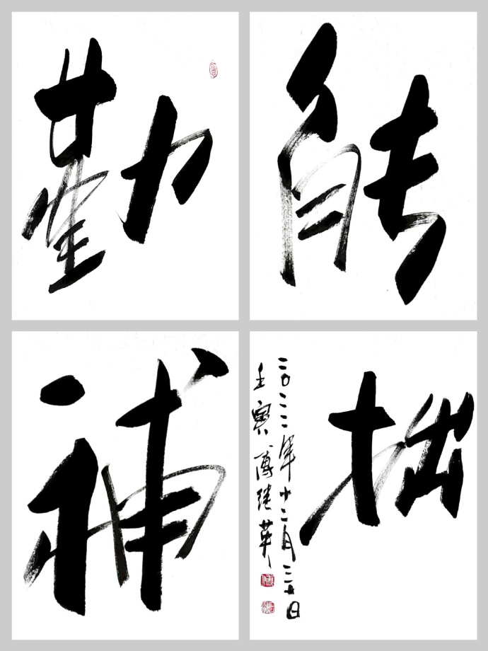 傅继英书法:勤能补拙。意思是指勤奋努力可以弥补天资的不足。一个人成功或成才,不在于你天生聪明或愚笨,只要勤劳肯干,勤学苦练,具有“铁杵磨成针”的毅力和意志,水滴石穿的精神,就能够弥补自己的笨拙,成为有用之才。