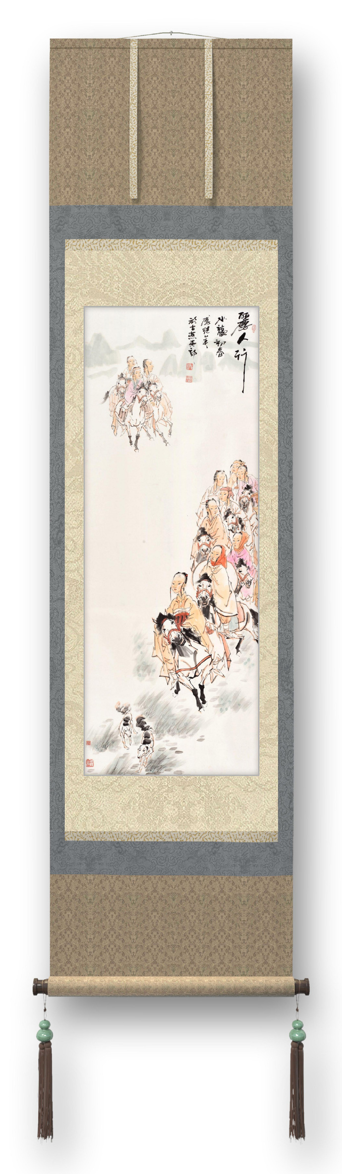 傅继英国画作品《丽人行》的背景取材自唐代诗人杜甫的同名作品,内容描绘盛唐妇女在春节于长安水边漫步的情景。此幅面积小六尺共勾画出十几位神态各异的人物,九匹骏马,描绘了宫庭贵族的游逸生活,惟妙惟肖,生动感人,有着独特的审美价值。在春风的衬托下,令人感到春意满园,生气盎然。