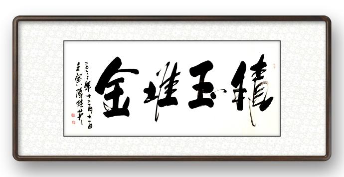 傅继英书法:积玉堆金。意思是形容聚敛的财富极多。金玉多得可以堆积起来,比喻极其富贵,寓意招财聚宝,日进斗金。出自《嘲少年》。