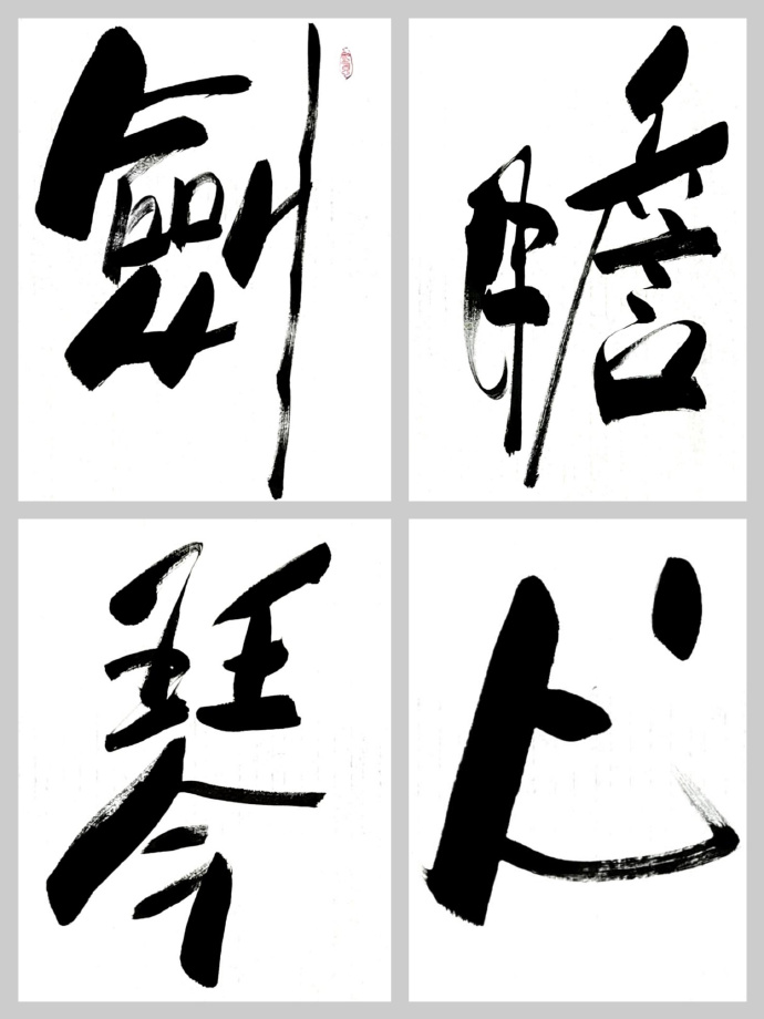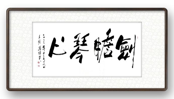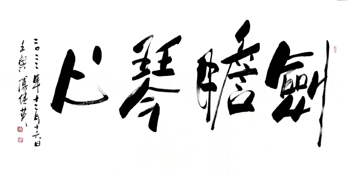 傅继英书法:剑胆琴心。琴心指的是内心丰富。比喻刚柔相济,任侠儒雅,既有情致,又有胆识(旧小说多用来形容能文能武的才子)。出自元·吴莱《寄董与几》诗:“小榻琴心展,长缨剑胆舒。” 后以“剑胆琴心”比喻刚柔相济,任侠儒雅。