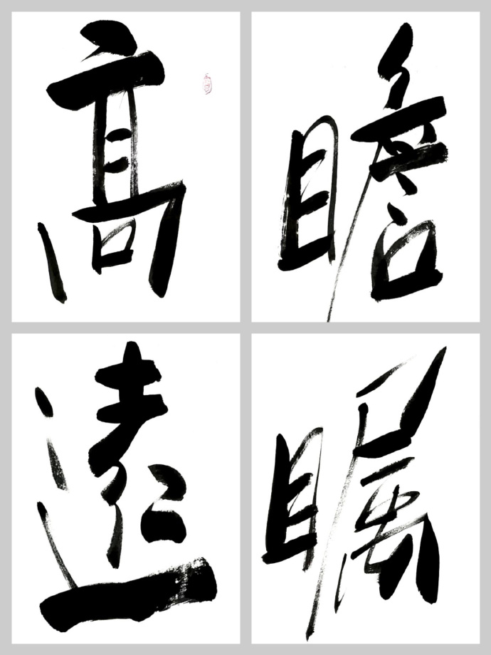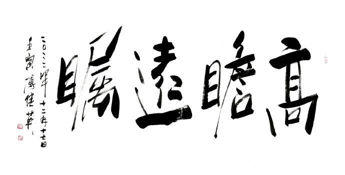 傅继英书法:高瞻远瞩。意思是站得高,看得远。比喻眼光远大,出自汉·王充《论衡·别通篇》:“夫闭户塞意,不高瞻览者,死人之徒也哉。”意思是:“看得高远,形容目光远大”,同时也比喻前途宽广,事业蒸蒸日上!