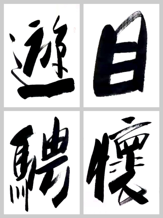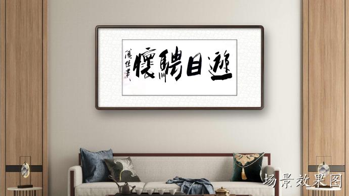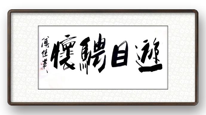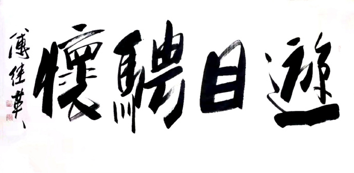 傅继英书法:游目骋怀。游目,目光由近到远,随意观览瞻望;骋怀,尽情开放胸怀。意思是放眼纵观或者流览,骋怀则表示放开胸怀,连起来的意思就是放眼望过去四处看,开阔心胸。出自晋 王羲之《兰亭集序》,“仰观宇宙之大,俯察品类之盛,所以游目骋怀,足以极视听之娱,信可乐也。”