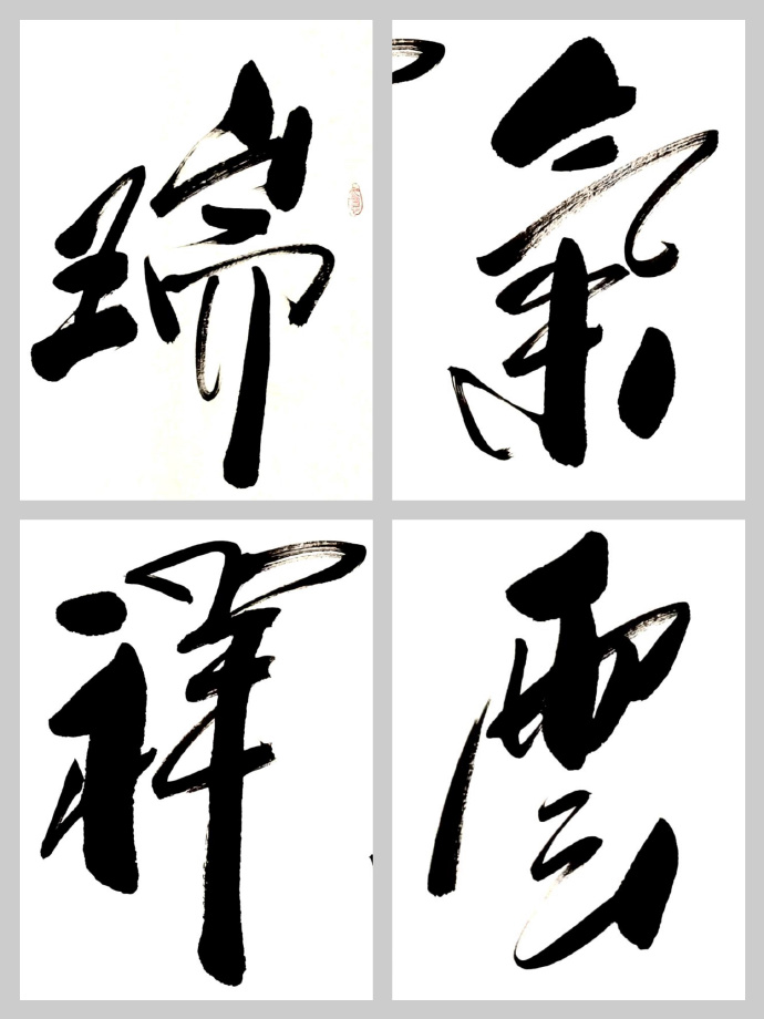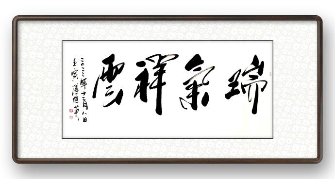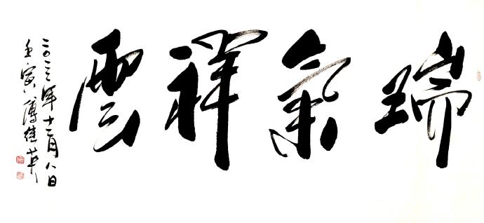 傅继英书法:瑞气祥云。意思是天上的云气呈现吉祥的征兆,意思是喜事降临的征兆。出自明·无名氏《度黄龙》第一折“今到此山之中,观见瑞气祥云,氤氲于九霄之上。”