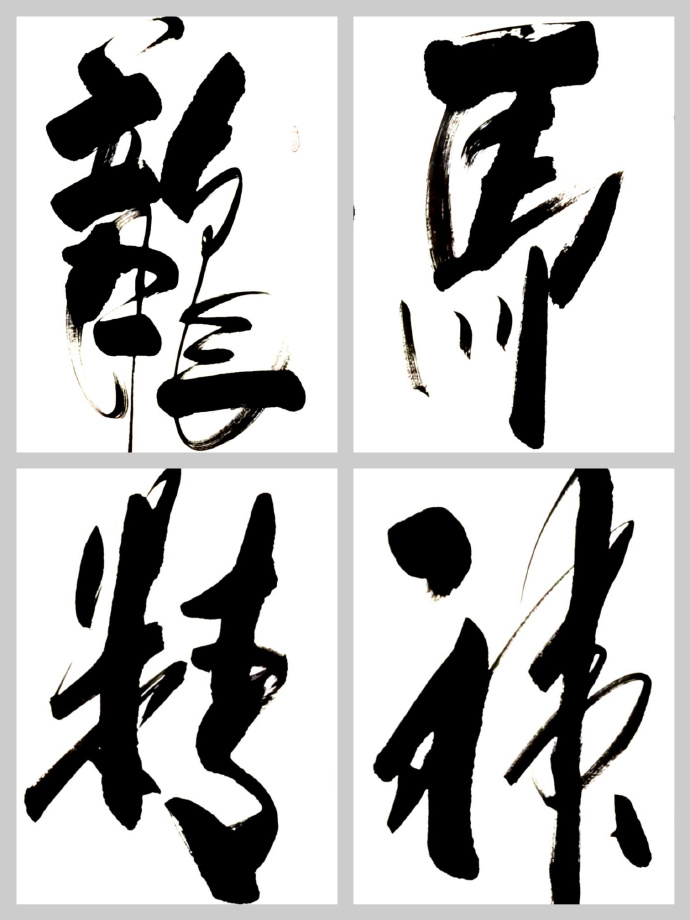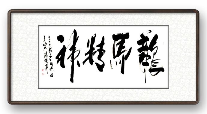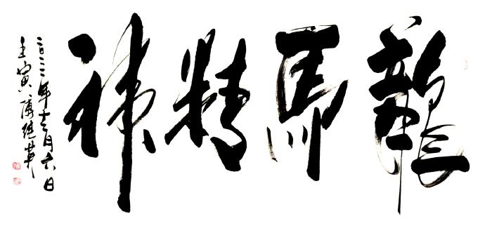 傅继英书法:龙马精神。《易经》中说:“乾为龙”,它是天的象征又代表着君王、父亲、大人、君子、祖考、金玉、敬畏、威严、健康、善良、远大、原始、生生不息……坤为马,象征大臣,母亲,女性,包容忠贞的精神。龙马精神,就是像龙马一样精神。形容健旺非凡,小心谨慎,能屈能伸的精神。也常用于比喻年老而精神健壮。