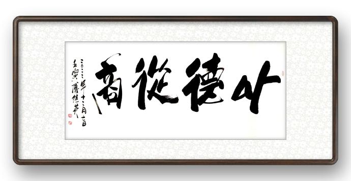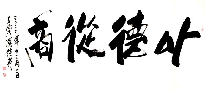 傅继英书法:以德从商。该词语不难理解,要用好的品德来从商,所以,此幅佳作挂在企业公司办公室,尤其是做生意的场所是相当合适的。不仅能起到装饰作用,而且更能增加公司或自己的信誉,使人更放心与自己合作,作为礼品馈赠给做生意的朋友也是很不错的选择。