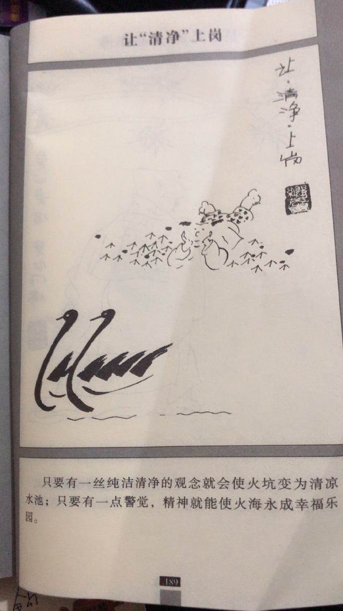 傅继英国画作品《让“清净”上岗》,只要有一丝纯结清净的观念就会使火坑变为清凉水池;只要有一点警觉,精神就能使火海永成幸福乐园。