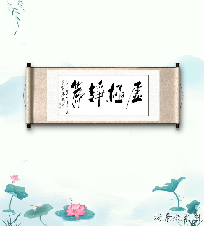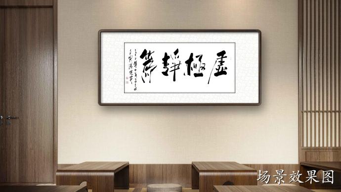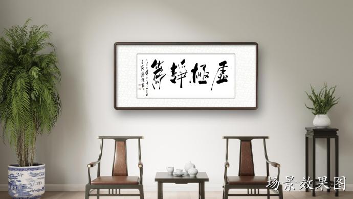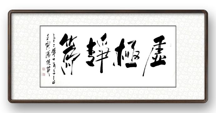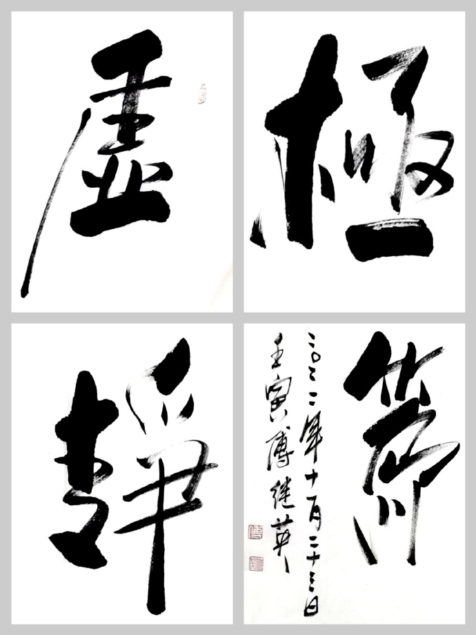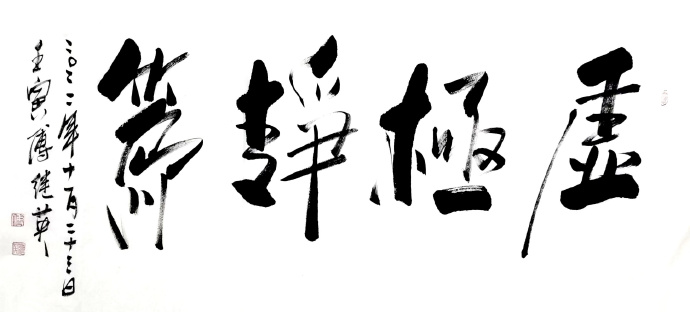 傅继英书法:虚极静笃。出自老子的《道德经》第十六章。 原文为:“致虚极,守静笃。万物并作,吾以观其复。” 含义:使心灵保持虚和静的至极笃定状态,不受影响,为的是万事万物并行发生时,我用这种心态观察事物循环往复的规律。这是老子告诉世人求道的方法,何为道,道是客观世界运行规律,是自然的(自然:自己本身就这样)的内在趋动因素。